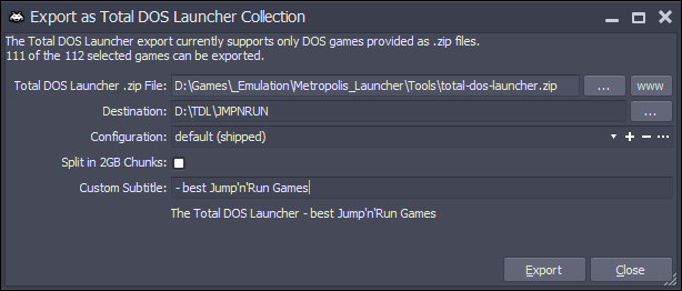 Étape 8 : sélectionnez les jeux que vous voulez, cliquez dessus avec le bouton droit de la souris et sélectionnez Exporter -- Exporter vers Total DOS Collection. Cela configurera automatiquement les fichiers zip avec le format de fichier 8.3, indexera les fichiers et les placera dans un dossier de fichiers (il peut également les séparer automatiquement en fichiers, fichiers1, fichiers2 dossiers dans des mandrins de 2 Go afin que vous puissiez répartir les fichiers sur plusieurs Les VHD et Total DOS Launcher les trouveront automatiquement. S'il ne trouve pas les zips, vérifiez votre fichier TLD.INI et mettez à jour proglocations=files;D:\TDL\files2;e:\TDL\files3